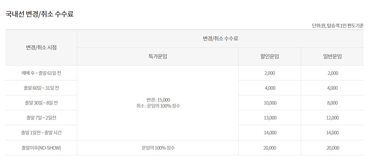 단, 특가운임 항공권을 구매하신 고객들의 경우, 국내선 항공권 변경수수료는 15,000원, 취소수수료는 운임의 100% 징수하고 있습니다.