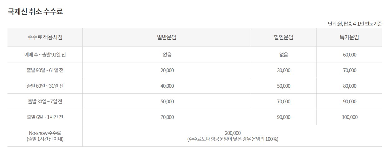 단, 국내선은 출발시각 이후에는 수수료가 부과되며, 국제선의 경우, 출발기준 1시간 전에는 수수료가 부과됩니다.