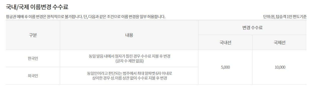 외국인의 경우, 동일인이라고 판단되는 범주 안에서 최대 알파벳 6자 이내로 다를 경우! 성과 이름 상관없이 수수료를 지불하면 변경할 수 있습니다. 국내선은 5,000원, 국제선은 10,000원 입니다.