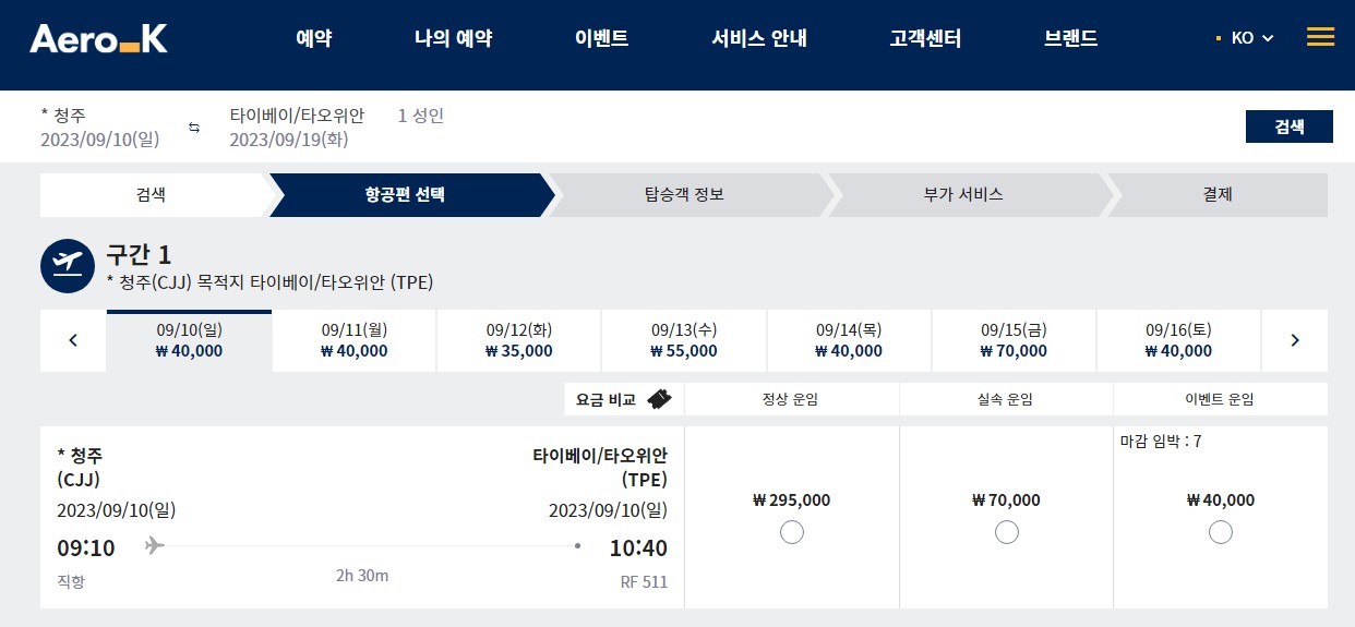 이벤트 운임이 다 판매가 되고나면 확실히 대만행 항공권의 가격이 뛰는 것을 확인할 수 있습니다.