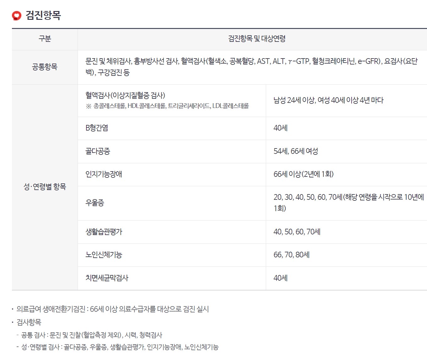 국민건강검진의 대상연령 모두가 똑같이 검사받는 항목으로는.문진 및 체위검사, 흉부방사선 검사, 혈액검사(혈색소, 공복혈당, AST, ALT, r-GTP, 혈청크레아티닌, e-GFR) 요검사(요단백), 구강검진 등이 있습니다.