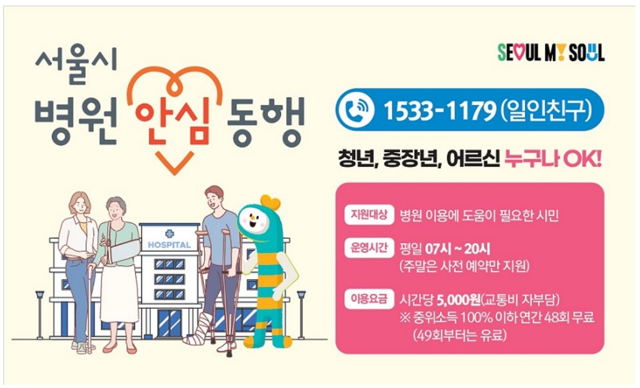 서울시에서 운영중인 서울시 병원 안심동행 서비스를 이용하면 좋을 것 같아서 정보 공유합니다.