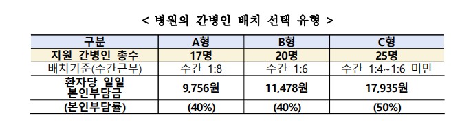 (병원이 환자 수 및 환자 중증도에 따라 간병인력을 배치, 2~3교대근무)
