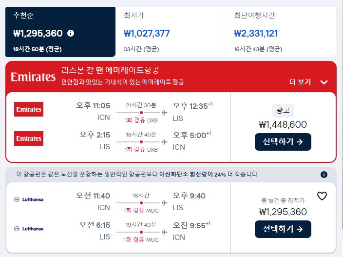 첫 화면에서는 포르투와 리스본의 항공권 가격이 크게 차이가 나지 않았는데요.