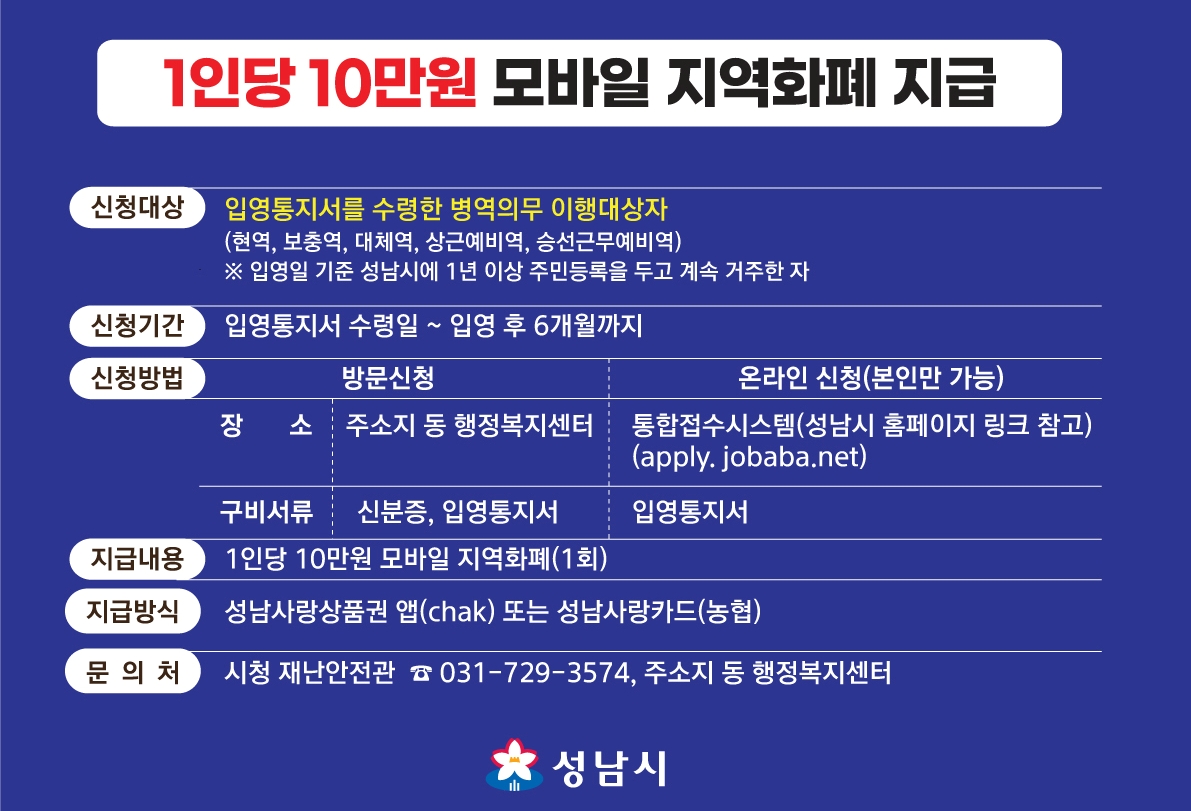 입영소지자 1인당 10만원 지급 (모바일 지역화폐로 지급)