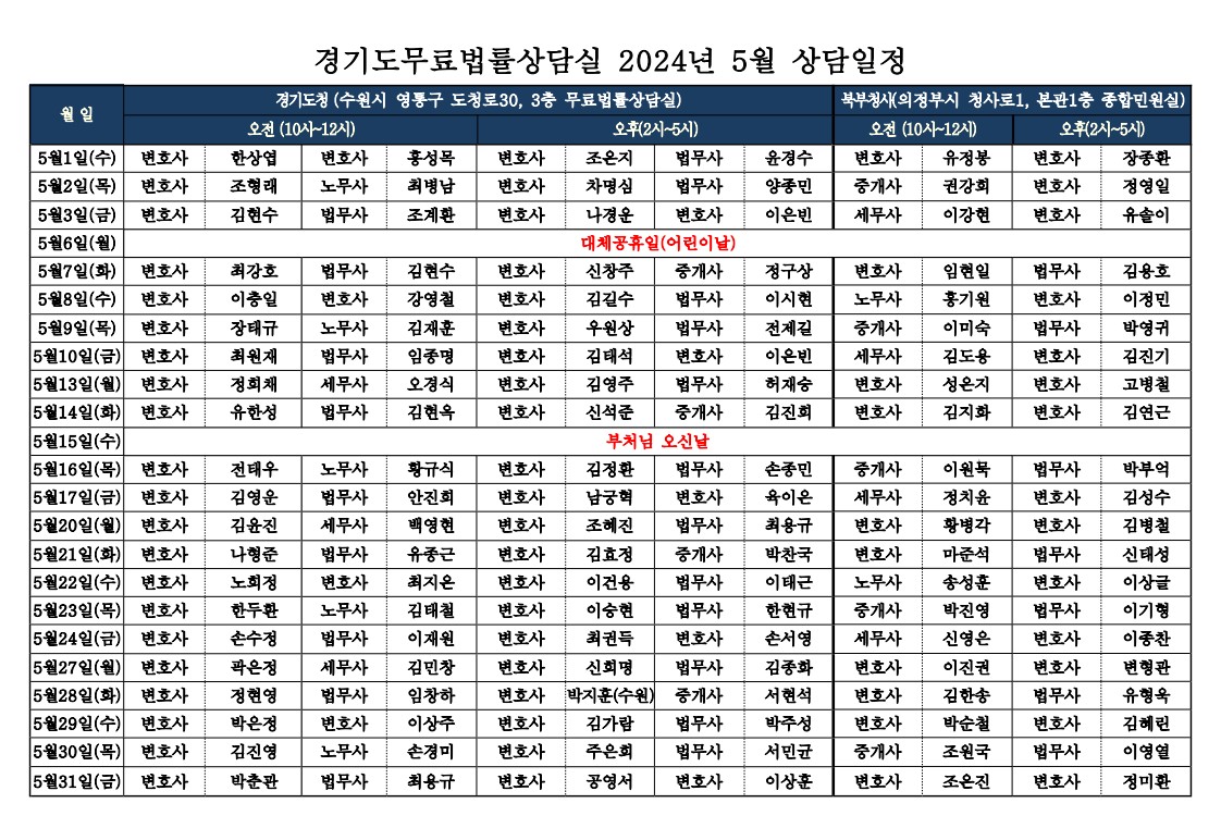 경기도청에서는 매월 상담일정을 올려주는데요. 오늘은 포스팅 기준 2024년 5월 무료 법률상담 일정표를 보여드리겠습니다. 아래 그림을 확인하시면 됩니다.