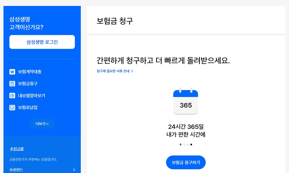 위에서 알려드린 삼성생명 실비보험 청구서류를 준비하셨다면, 삼성생명 홈페이지에서 청구하시면 됩니다. 아래 링크를 누르시면, 삼성생명 홈페이지 보험금청구 페이지로 바로 연결됩니다.