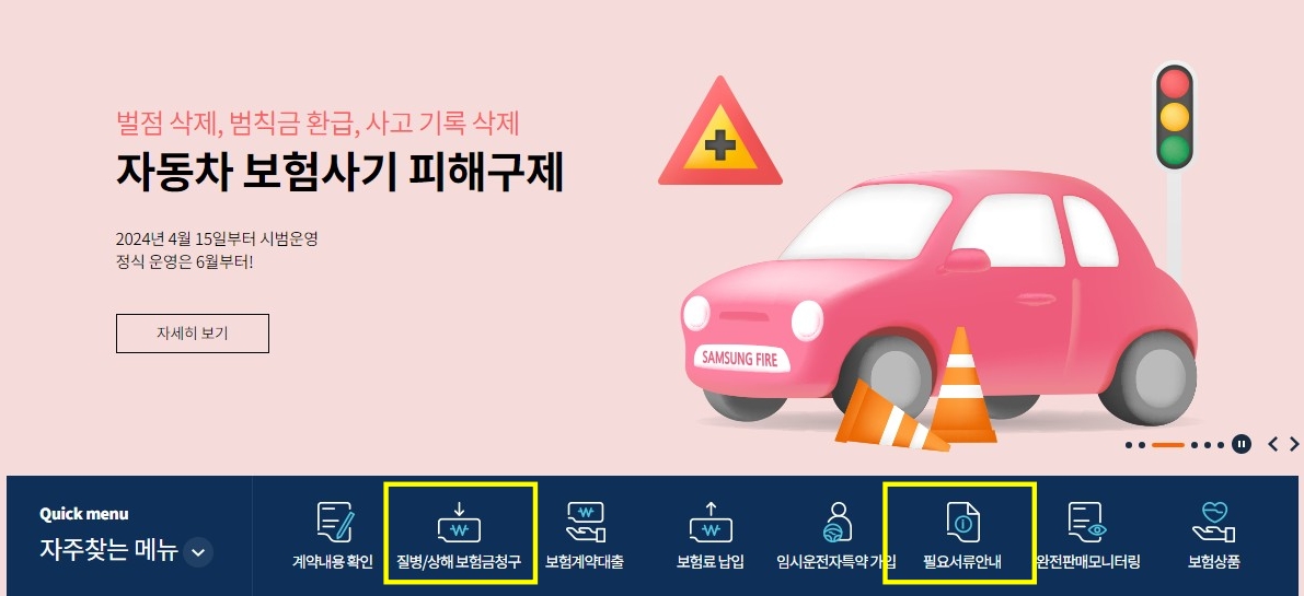삼성화재 홈페이지에 들어가시면 메인 화면에서 퀵메뉴를 보실 수 있는데요. 여기서 노란색 네모로 체크되어 있는 부분을 통해 청구 서류 확인도 가능하고, 직접 청구 신청도 가능합니다. (참고로 회원 로그인과 비회원 로그인으로 나뉘어지며, 로그인시 인증서 등이 필요할 수 있습니다.)