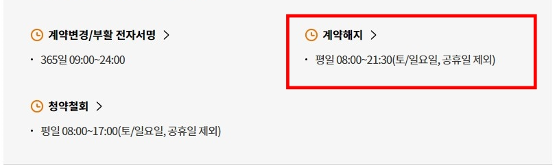 하지만 보험해지의 경우, 이용가능시간이 정해져있는데요. 평일 오전 8시~저녁 9시 30분(토/일요일, 공휴일 제외)으로 안내 되어 있습니다.