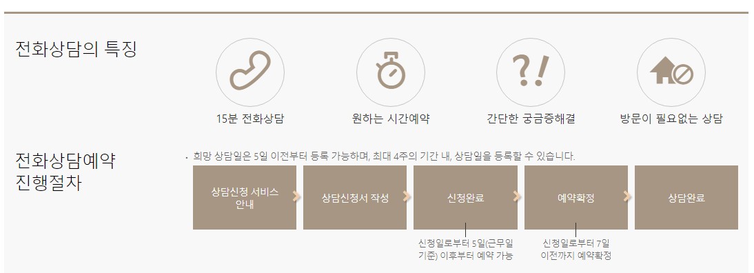 - 전화상담예약 진행절차: 희망상담일은 5일전부터 등록 가능 (최대 4주 기간 내에 상담일 선택 가능)