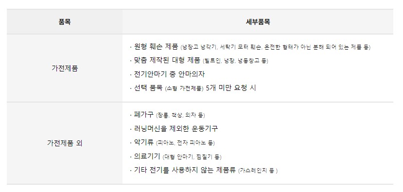가전제품에는 원형이 훼손된 제품, 맞춤 제작된 대형 제품, 전기안마기 중 안마의자, 선택품목 5개 미만 요청시에는 수거하 하지 않습니다.
