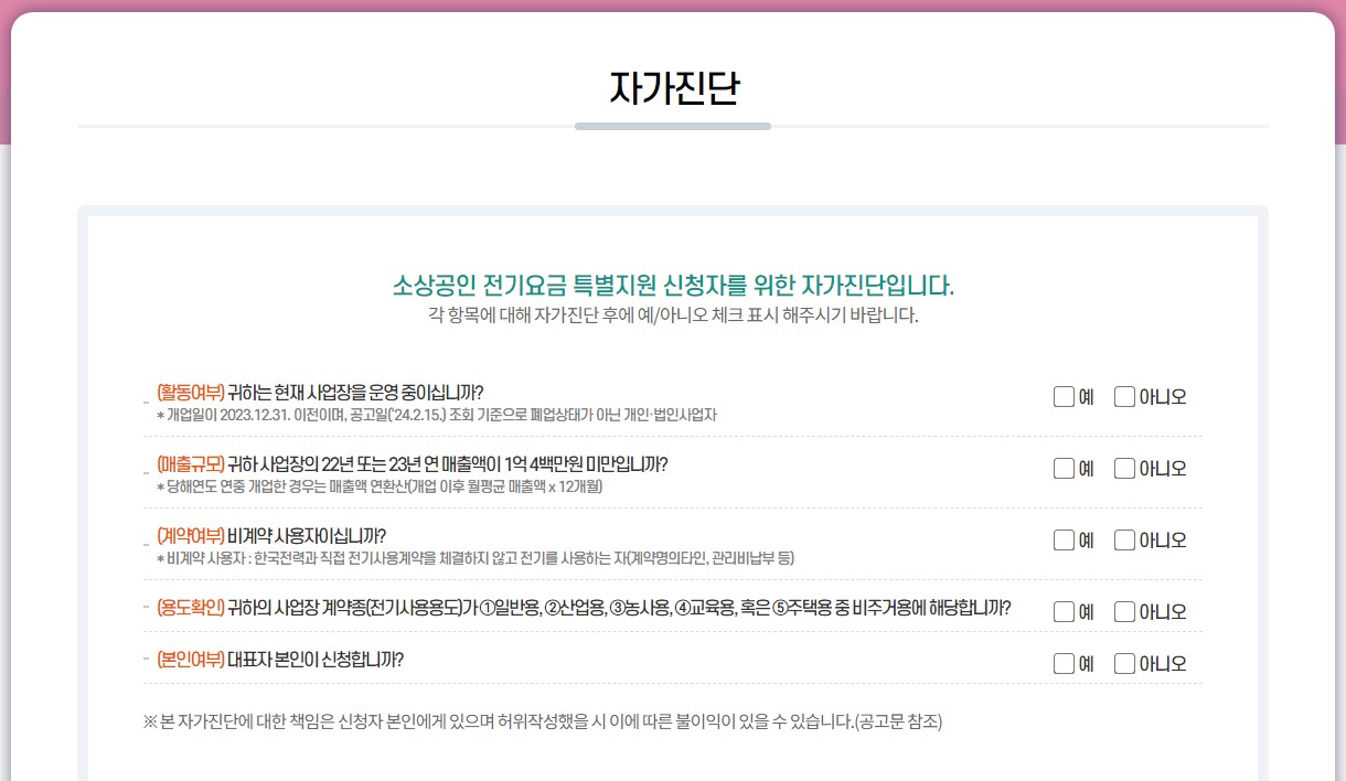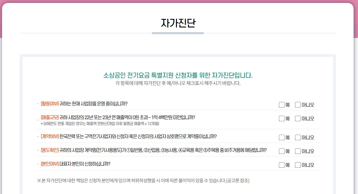 소상공인 전기요금 특별지원 신청자를 위한 자가진단 또한 홈페이지에서 제공되고 있습니다.
