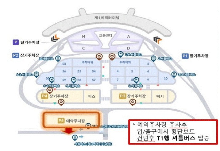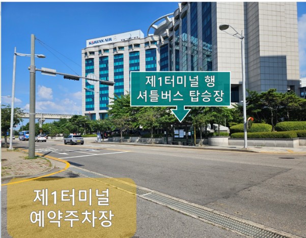 제1터미널 예약주차장 입구 맞은편 정류장을 이용하시면 됩니다.