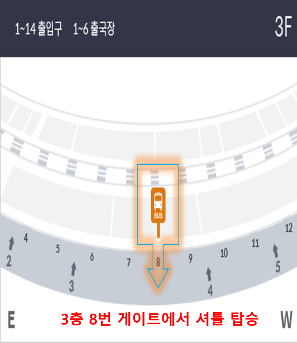 입국시 예약주차장으로 가실 분들은 여객터미널 3층 8번출구 정류장을 이용해서 셔틀버스를 탑승하시면 됩니다.