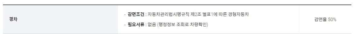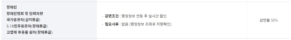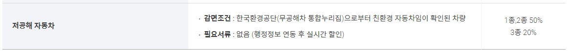 경차, 장애인, 장애인협회 및 단체차량, 국가유공자(상이등급), 5.18 민주 유공자(장애등급), 고엽제 후유증 환자(장애등급), 다자녀가구 등은 최대 감면율 50%입니다. 저공해자동차의 경우, 1종과 2종은 50% 감면받을 수 있고, 3종의 경우 20%감면 받을 수 있습니다.