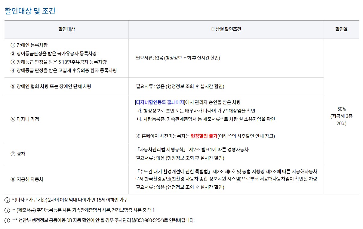 할인대상으로는 장애인등록차량, 상이등급판정을 받은 국가유공자 등록차량, 장해등급 판정을 받은 518민주유공자 등록차량, 장애등급 판정을 받은 고엽제 후유의증 환자 등록차량, 장애인 협회 차량 또는 장애인 단체 차량, 다자녀가정, 경차, 저공해 자동차 입니다.