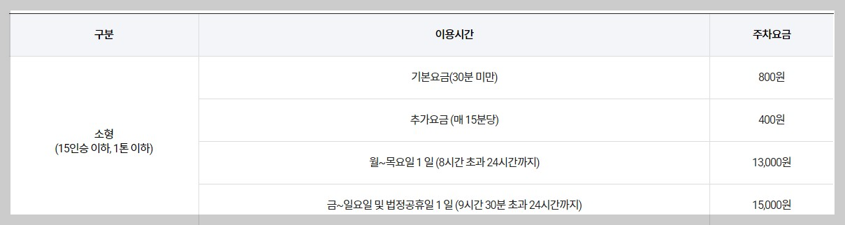 소형(15인승 이하, 1톤이하) 차량의 주차장요금을 살펴보면 아래와 같습니다.