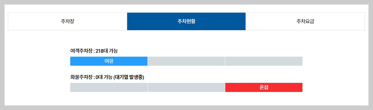 대구공항 주차장 혼잡도를 확인하시면, 현재 주차 가능대수가 몇대인지 바로 확인하실 수 있습니다.