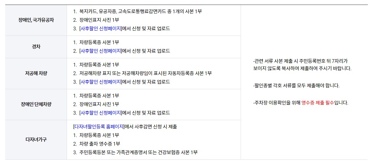관련 서류들의 사본을 제출할 때 주민등록번호 뒷자리가 보이지 않도록 복사해서 제출해주시기 바랍니다. 또한 할인종별 각호 서류를 모두 제출해주셔야 합니다. 또한 주차장 이용확인을 위해서 영수증 제출은 필수입니다.