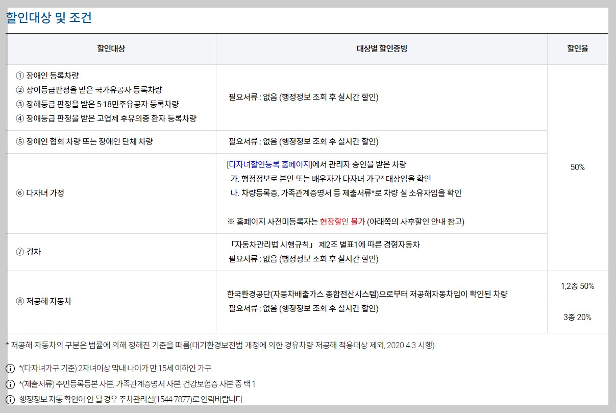 다자녀 가정의 경우, 다자녀할인등록 홈페이지에서 관리자 승인을 받은 차량에 한해서 50% 할인을 받을 수 있습니다. 다자녀 가정으로 할인을 받으실 분들이라면, 홈페이지에서 꼭 사전등록을 진행해주시기 바랍니다.