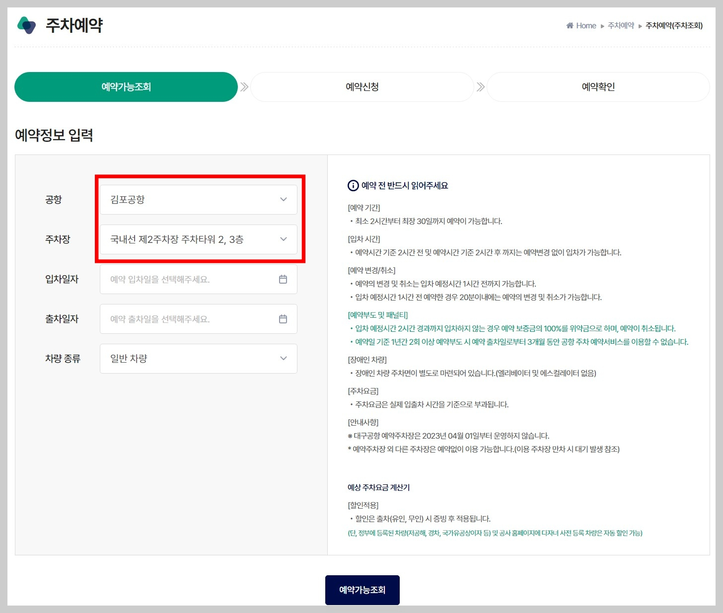 한국공항공사 홈페이지에 들어가셔서 김포공항을 선택, 국내선 제2주차장 주차타워 2,3층을 선택해주세요. 그리고 입차일시와 출차일시를 선택하고 예약가능조회를 눌러보세요. 바로 김포공항 예약주차장의 예약 가능여부를 알 수 있습니다.