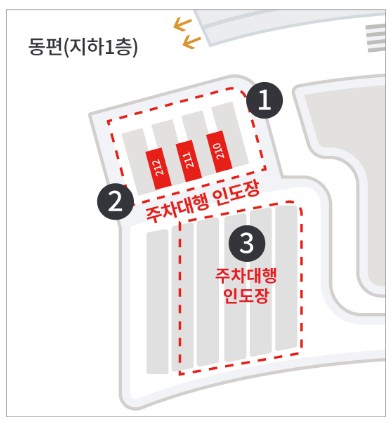 지하1층 동편주차장 210번 앞 주차대행 정산실로 이동합니다.