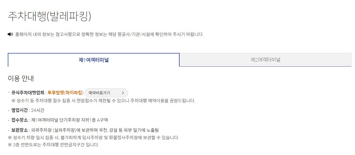 ※ 참고로 인천공항 제1여객터미널 주차대행 업체와 제2여객터미널 주차대행 업체가 다르기 때문에 이 부분 참고하시기 바랍니다. 인천공항 홈페이지에서 아래 그림과 같이 인천공항 주차대행 공식업체를 소개해두고 있습니다.