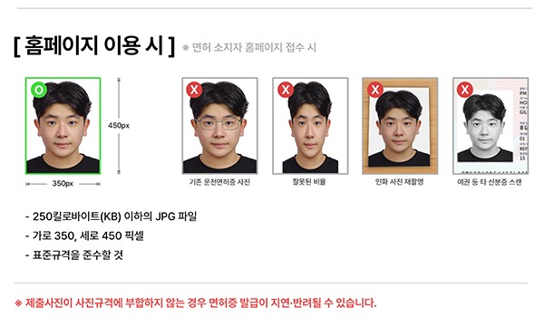위에서 소개해드린 사진 규격에 맞지 않는 사진으로 갱신을 신청하는 경우, 면허증 발급이 지연되거나 거부될 수 있습니다.