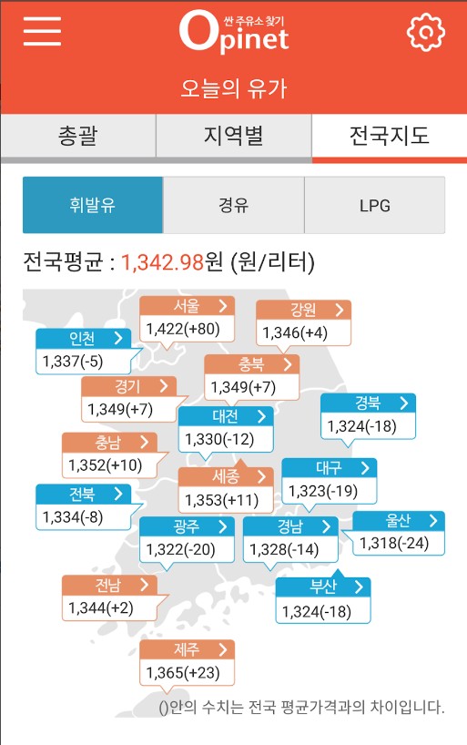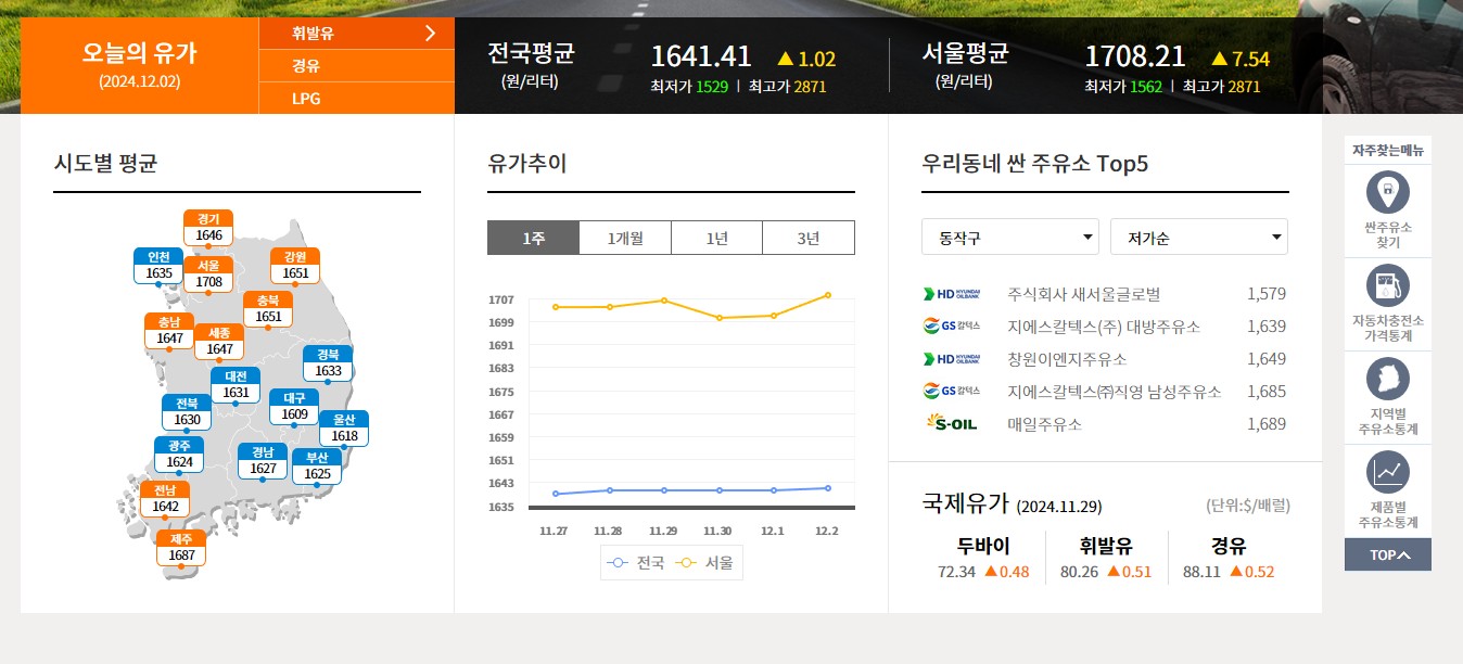오늘의 유가를 휘발유, 경유, LPG 모두 확인할 수 있습니다. 또한 전국 시도별 평균 가격 또한 바로 확인할 수 있습니다. 무엇보다 우리동네 싼 주요소 TOP5의 경우 정말 유용하게 비교해보며 사용할 수 있는 메뉴인 것 같습니다.