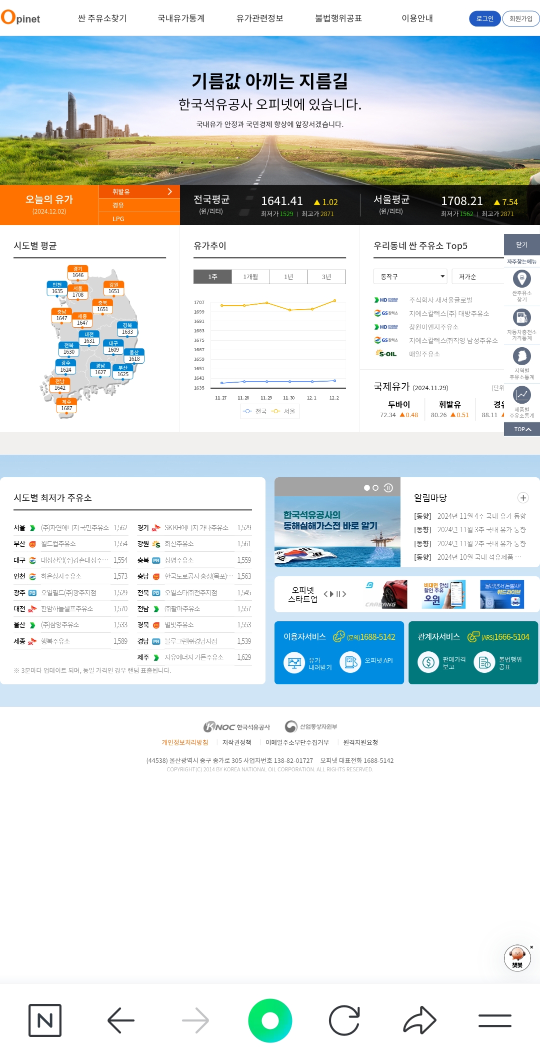 pc버전으로도 설명 드리겠습니다. 오피넷 홈페이지 메인에 가시면, 중앙에서 거의 대부분 우리가 필요한 정보들을 바로 검색해볼 수 있습니다.