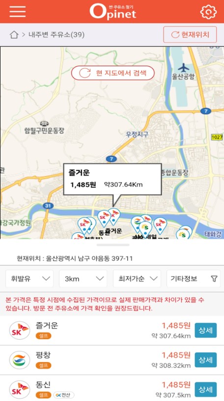 앱을 설치하셨다면 다양한 방법으로 가장 싼 주유소 찾기를 실행하실 수 있습니다.