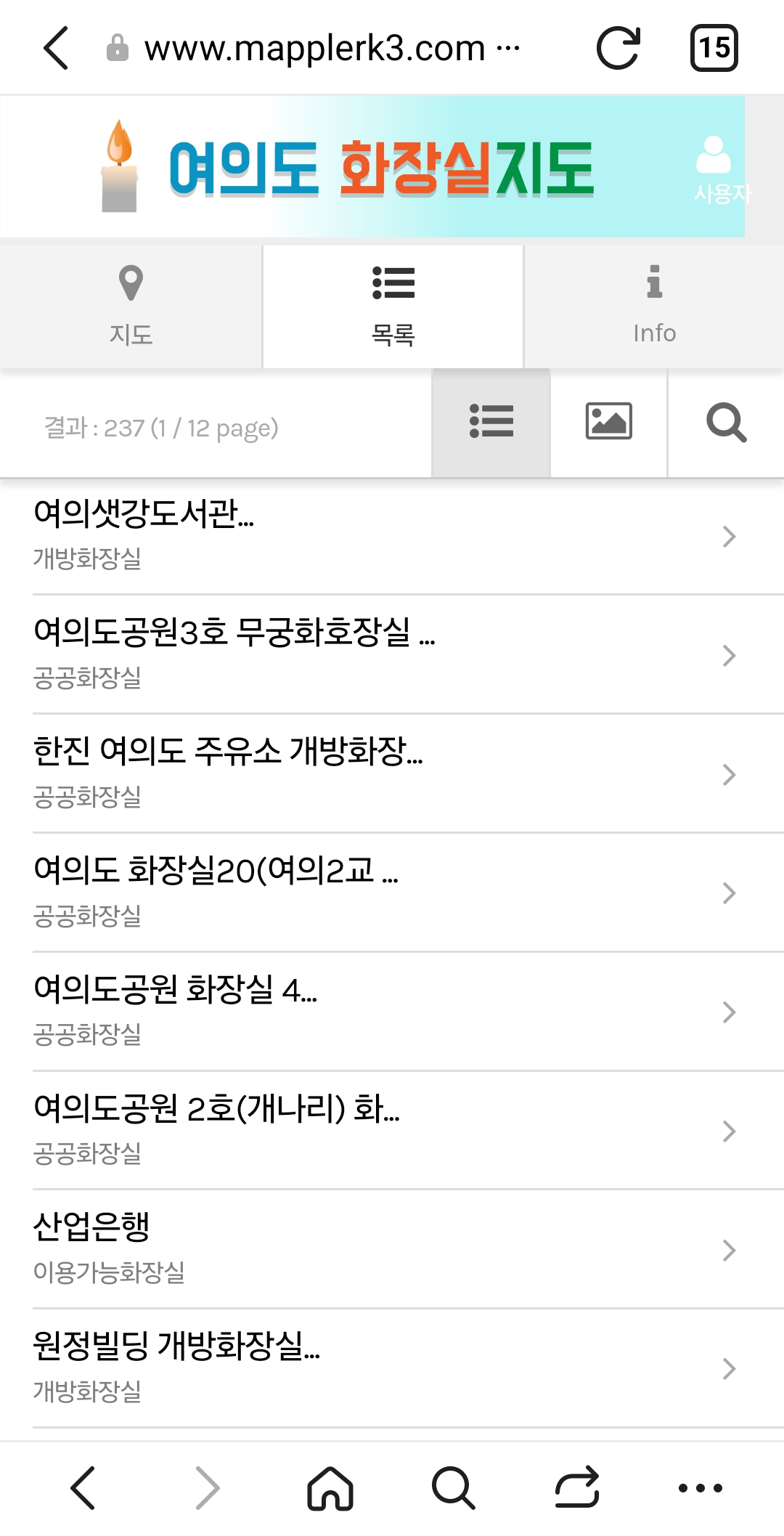 스마트폰으로 볼 때 화면입니다. 이렇게 여의도 화장실 목록을 볼 수 있으며, 심지어 사진 표시를 누르면 화장실이 어떻게 생겼는지도 볼 수 있습니다. 물론 모든 화장실 사진을 볼 수 있는 것은 아닙니다.