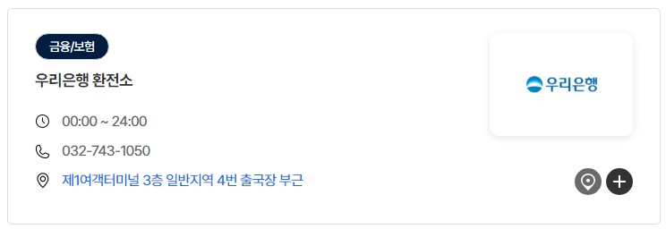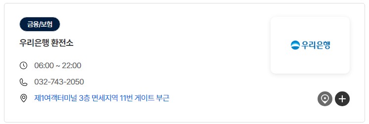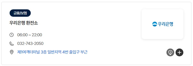 | 우리은행환전소 | 제1여객터미널 3층 일반지역 4번 출국장 부근 |