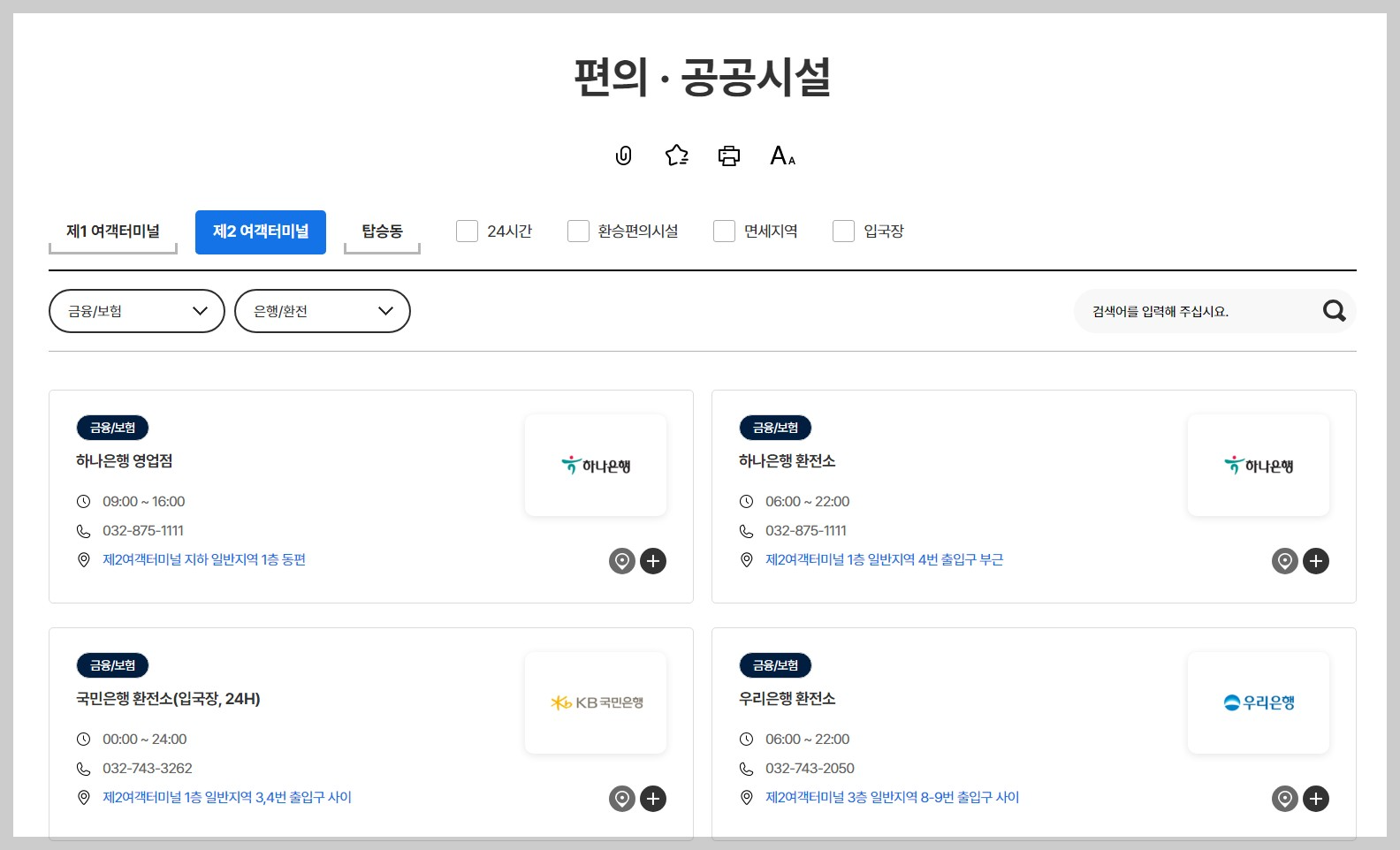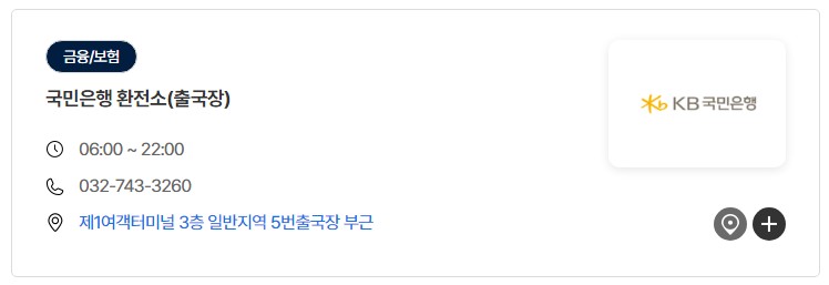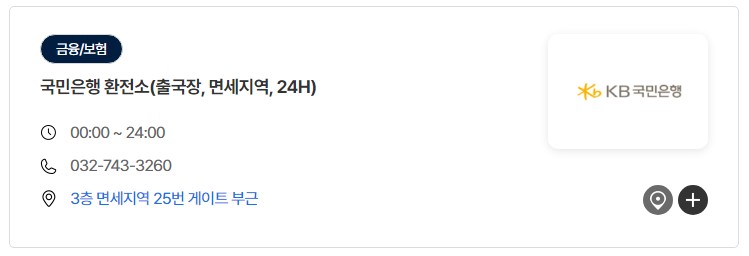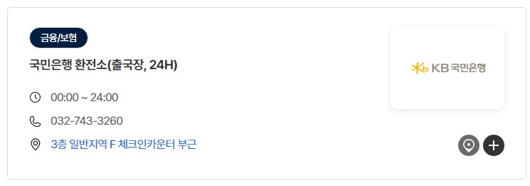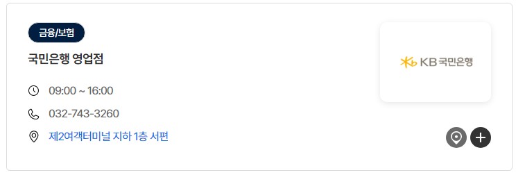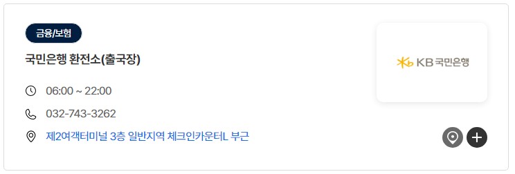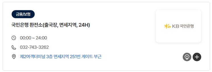 | 국민은행 영업점 | 09:00~16:00 | 제2여객터미널 지하 1층 서편 | 주말, 공휴일불가 |