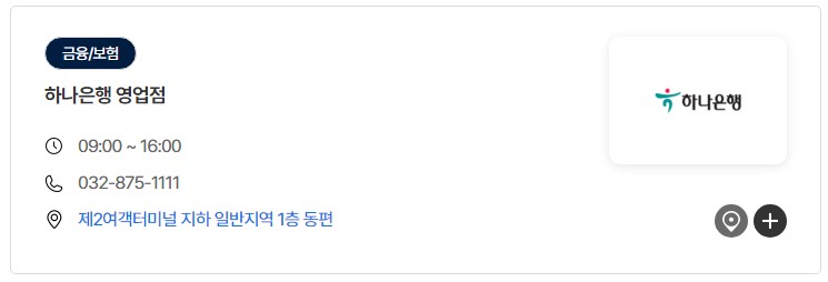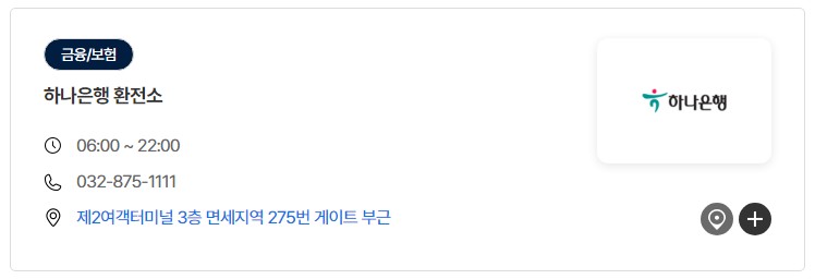 | 하나은행 영업점 | 09:00~16:00 | 제2여객터미널 지하 일반지역 1층 동편 | 주말.공휴일 불가 |