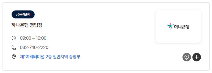 | 하나은행 영업점 | 09:00~16:00 | 제1여객터미널 2층 일반지역 중앙부 | 주말.공휴일 불가 |