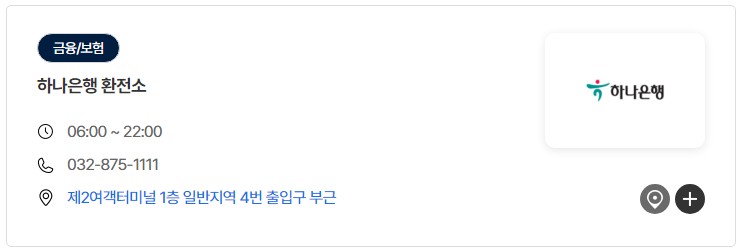 | 하나은행 환전소 | 06:00~22:00 | 제2여객터미널 1층 일반지역 4번 출입구 부근 | |
