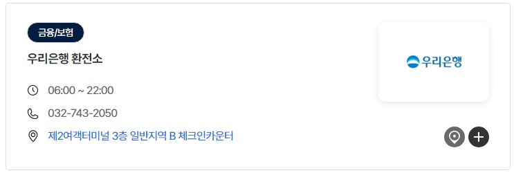 | 우리은행 영업점 | 09:00~16:00 | 제2여객터미널 지하 1층 동편 | 주말, 공휴일 불가 |