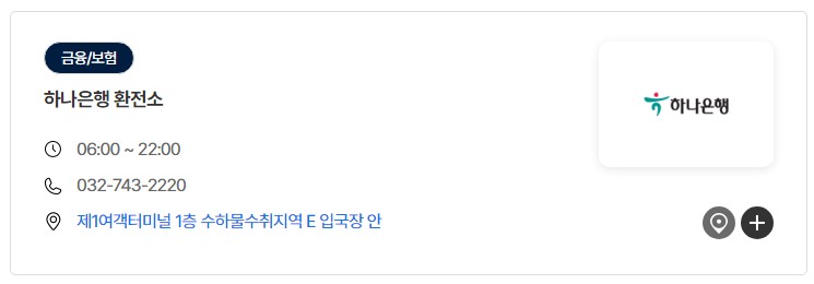 | 하나은행 환전소 | 06:00~22:00 | 제1여객터미널 1층 일반지역 4번 출입구 부근 | |
