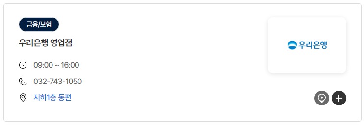 | 우리은행 영업점 | 09:00~16:00 | 지하1층 동편 | 주말, 공휴일 불가 |