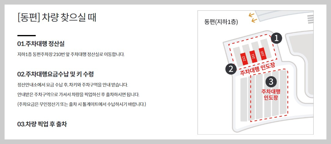- 지하1층 동편주차장 210번 앞 주차대행 정산실로 이동하기