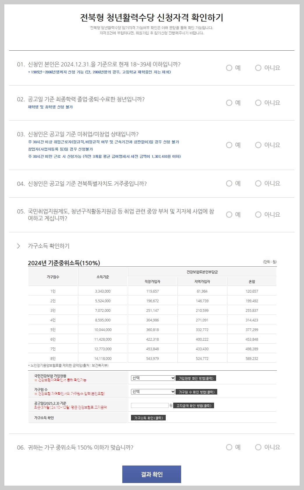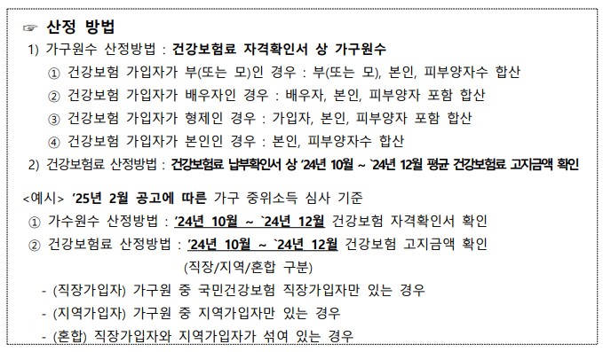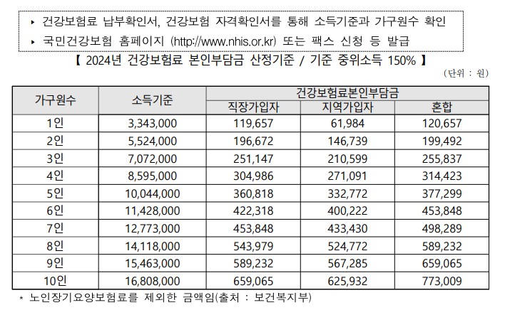 - 2024. 10월 ~ `2024. 12월 3개월 평균 “건강보험료 고지 금액”이 가구 기준 중위소득 150% 이하의 건강보험료 고지 금액 이하여야 함