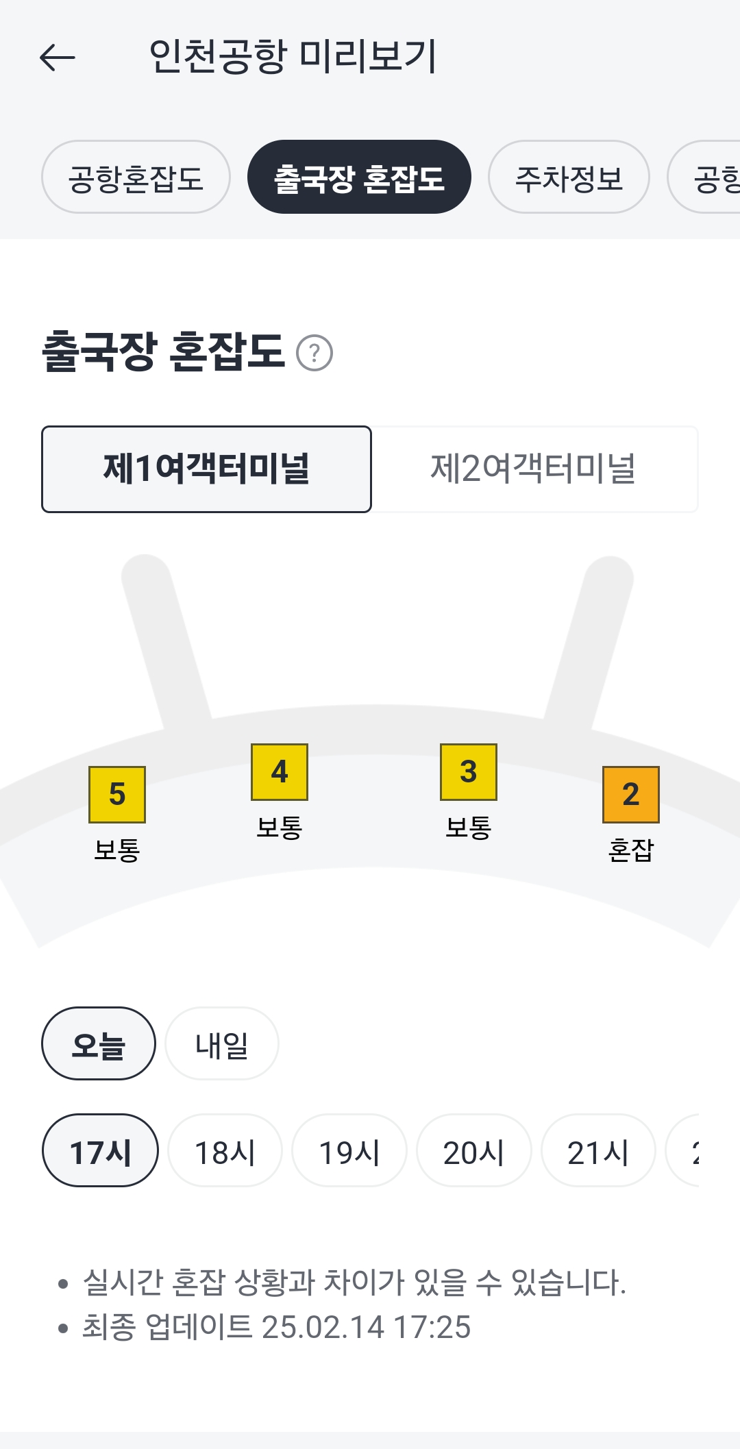 인천공항 예상 혼잡도는 매일 오후 5시에 업데이트되며, D+2일까지의 예상 정보를 제공합니다.