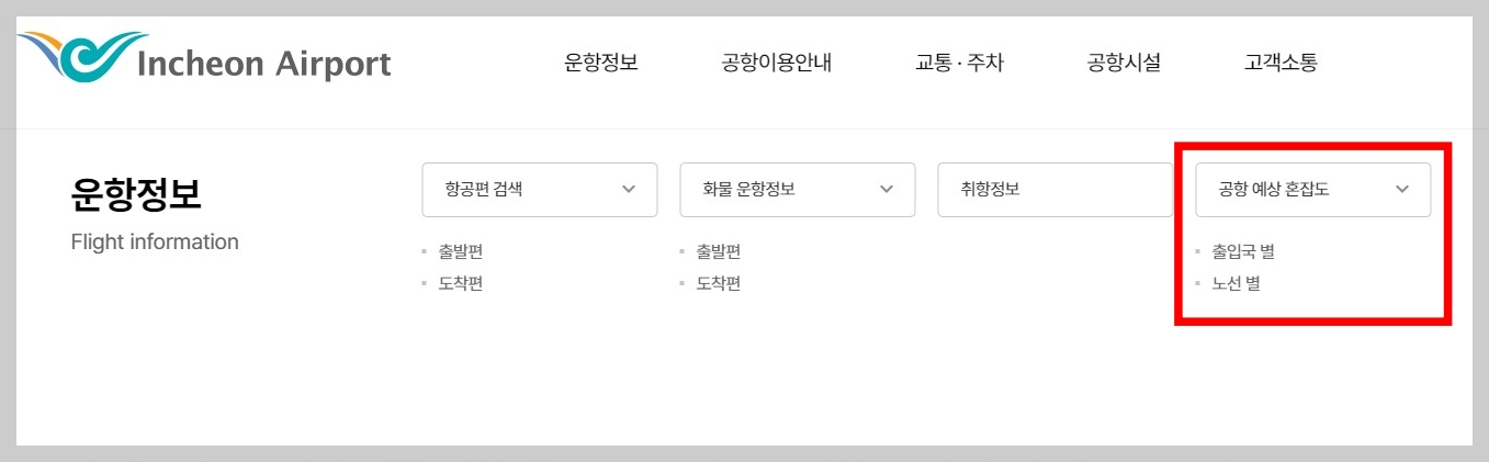 인천공항 공식 홈페이지에 접속하셔서 ‘운항정보’ > ‘공항 예상 혼잡도’ 메뉴를 선택해주세요.