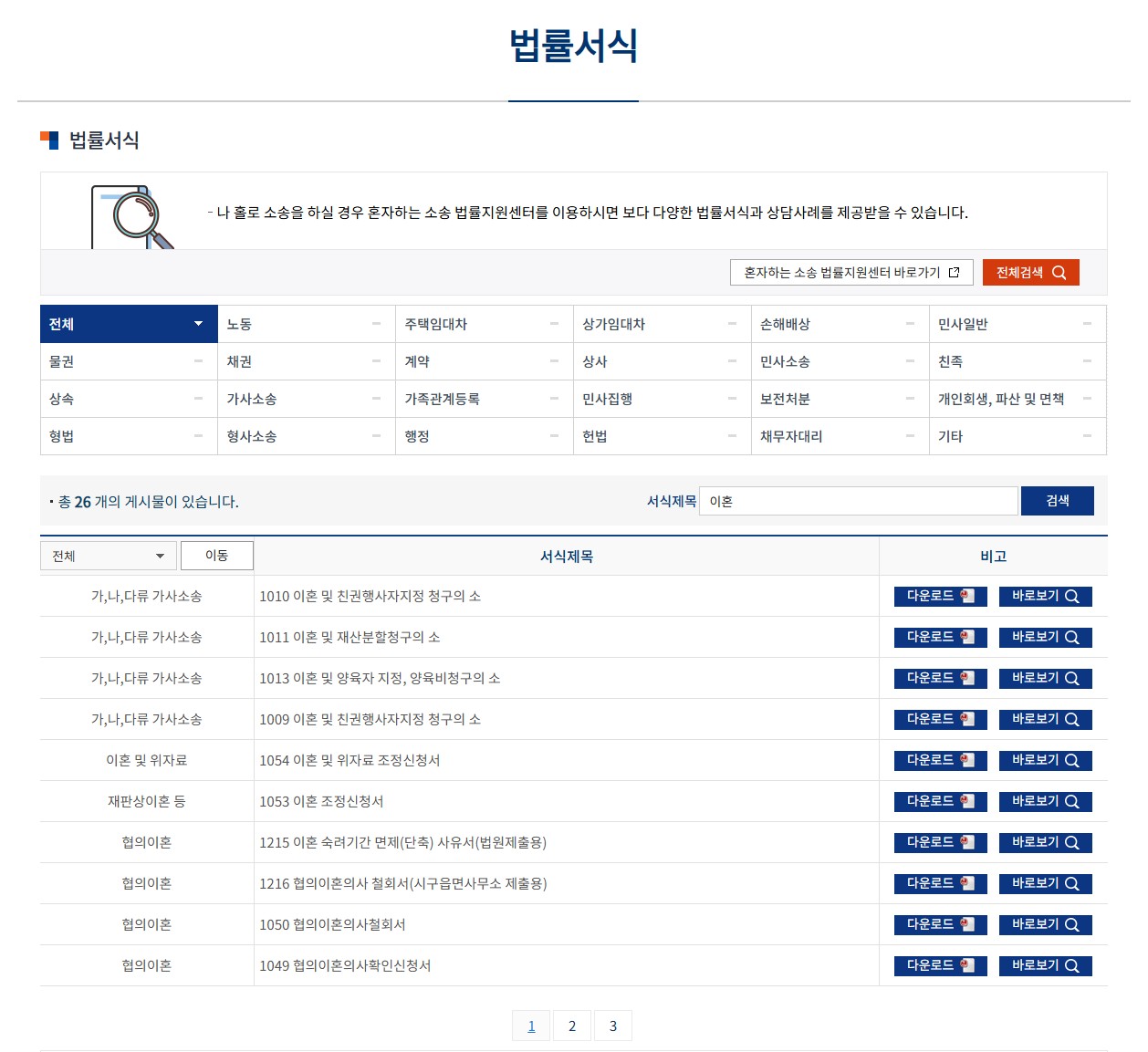 서식제목에 '이혼'을 검색하시면 이혼서류양식을 모두 무료로 다운로드 할 수 있습니다.