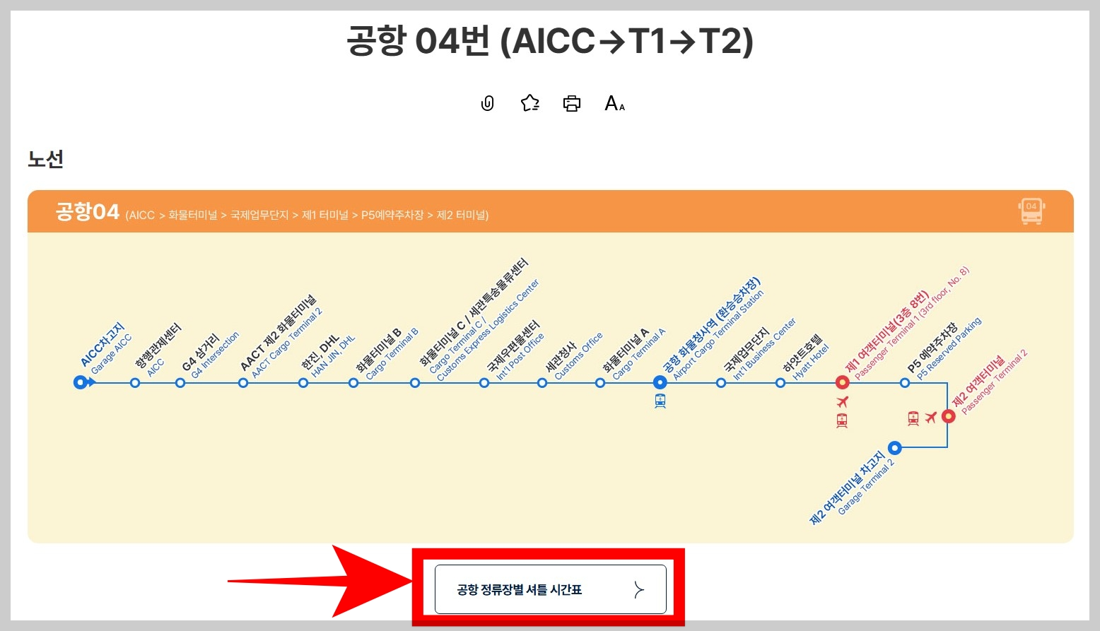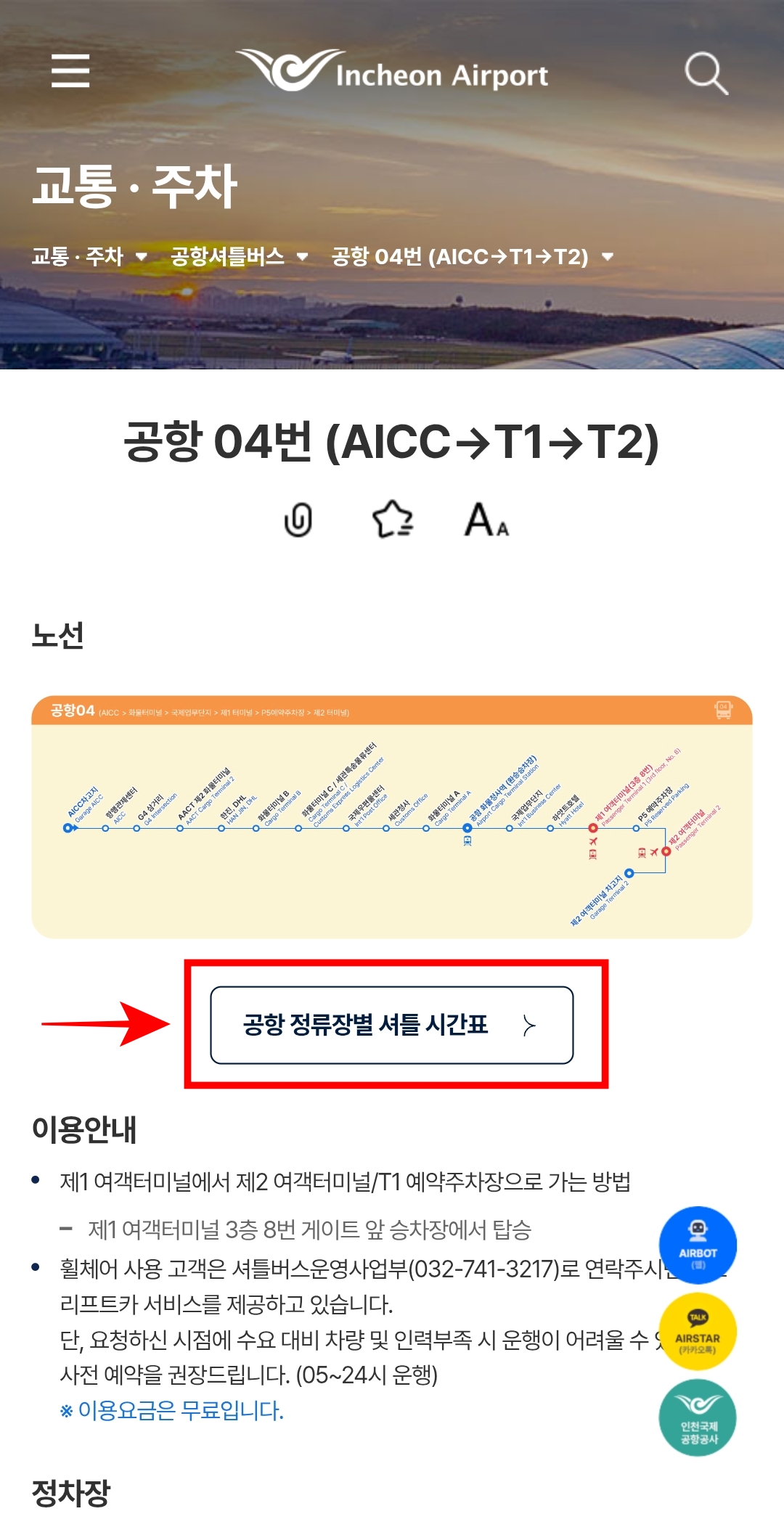 여기서도 빨간 네모 안에 있는 '공항 정류장별 셔틀 시간표'를 누르시고, 정류장을 선택하시면, 공항 04번 셔틀버스 시간표를 확인하실 수 있습니다.