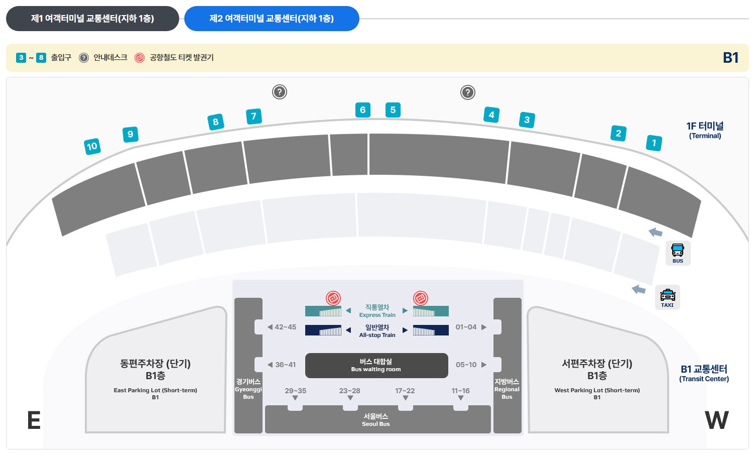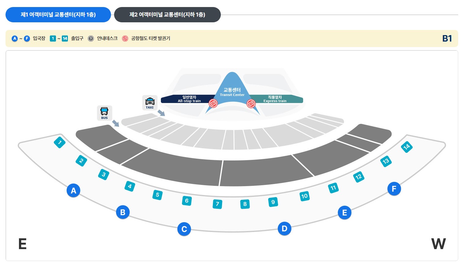 제1여객터미널 교통센터 지하1층에서 탑승하셔서 제 2여객터미널 교통센터 지하 1층에서 하차하시면 됩니다.