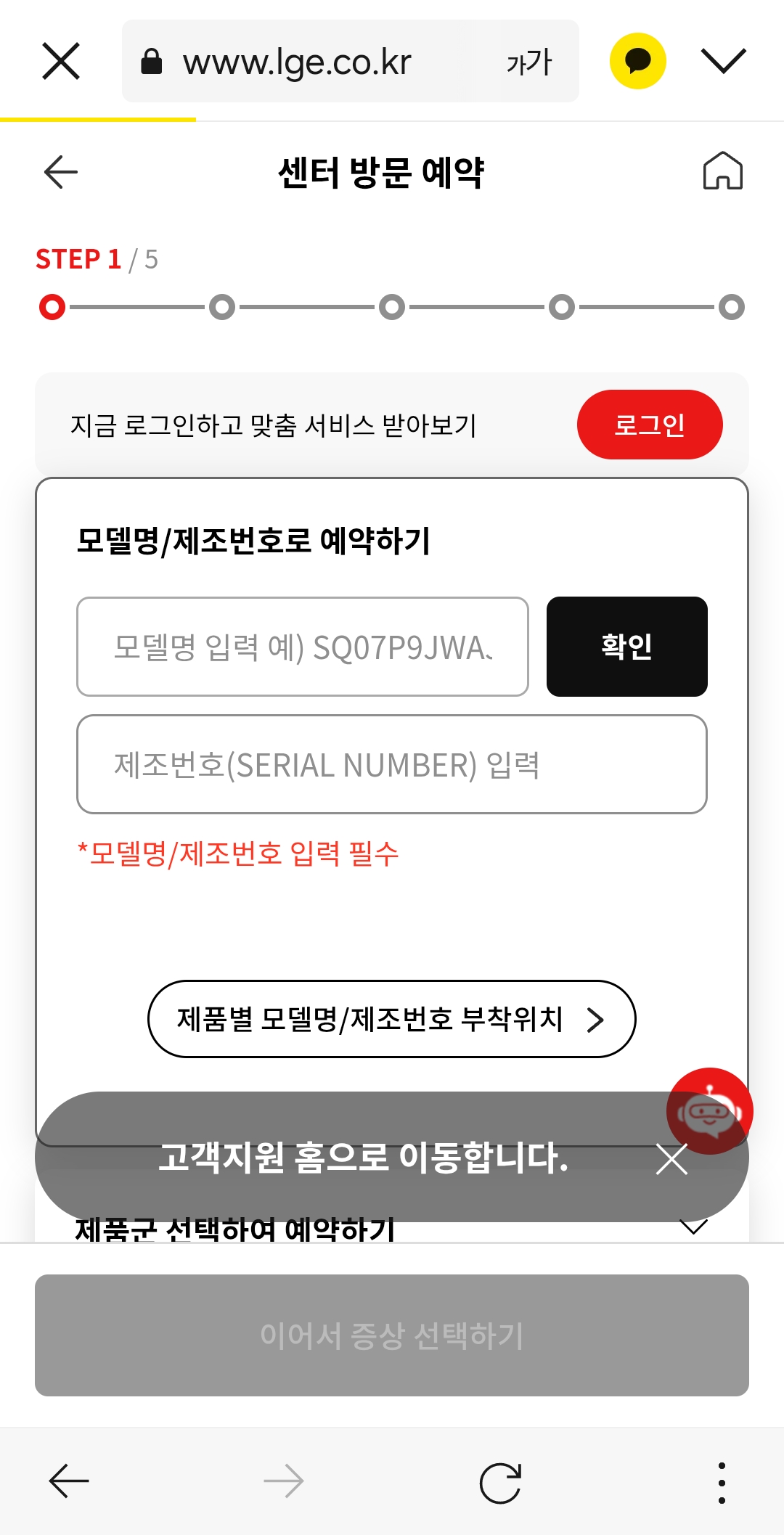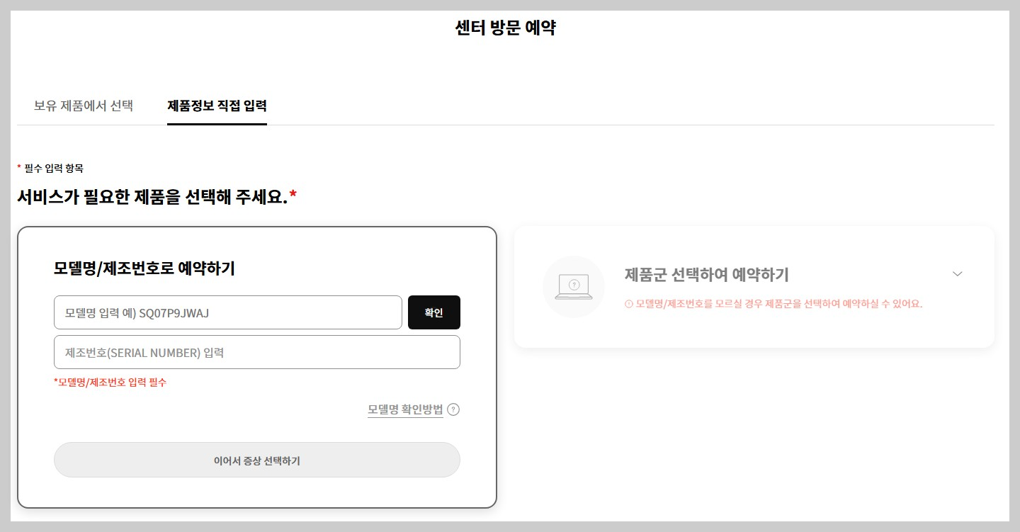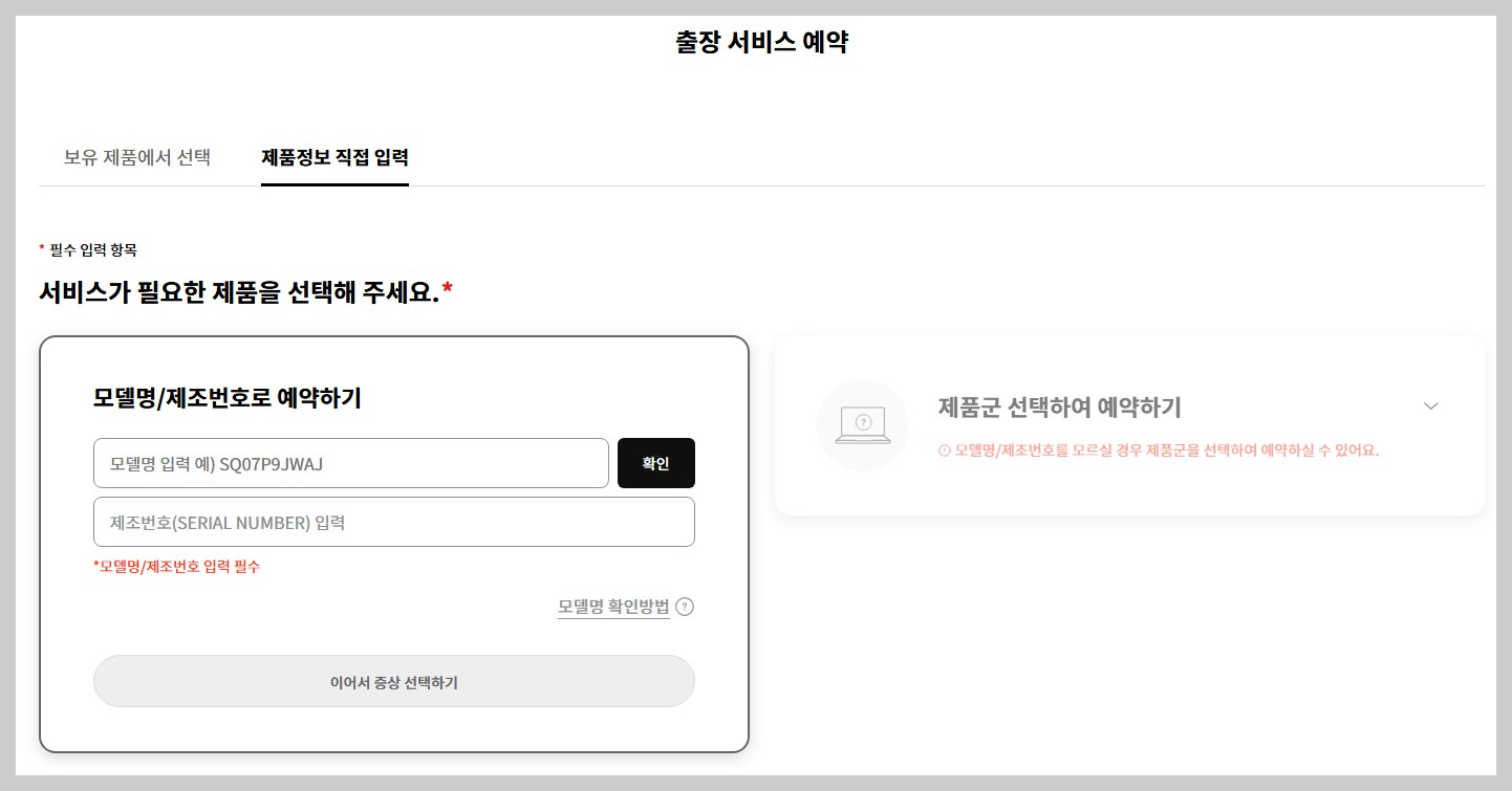 서비스가 필요한 제품의 모델명과 제조번호를 입력하시고, 출장 서비스를 예약하시면 됩니다.