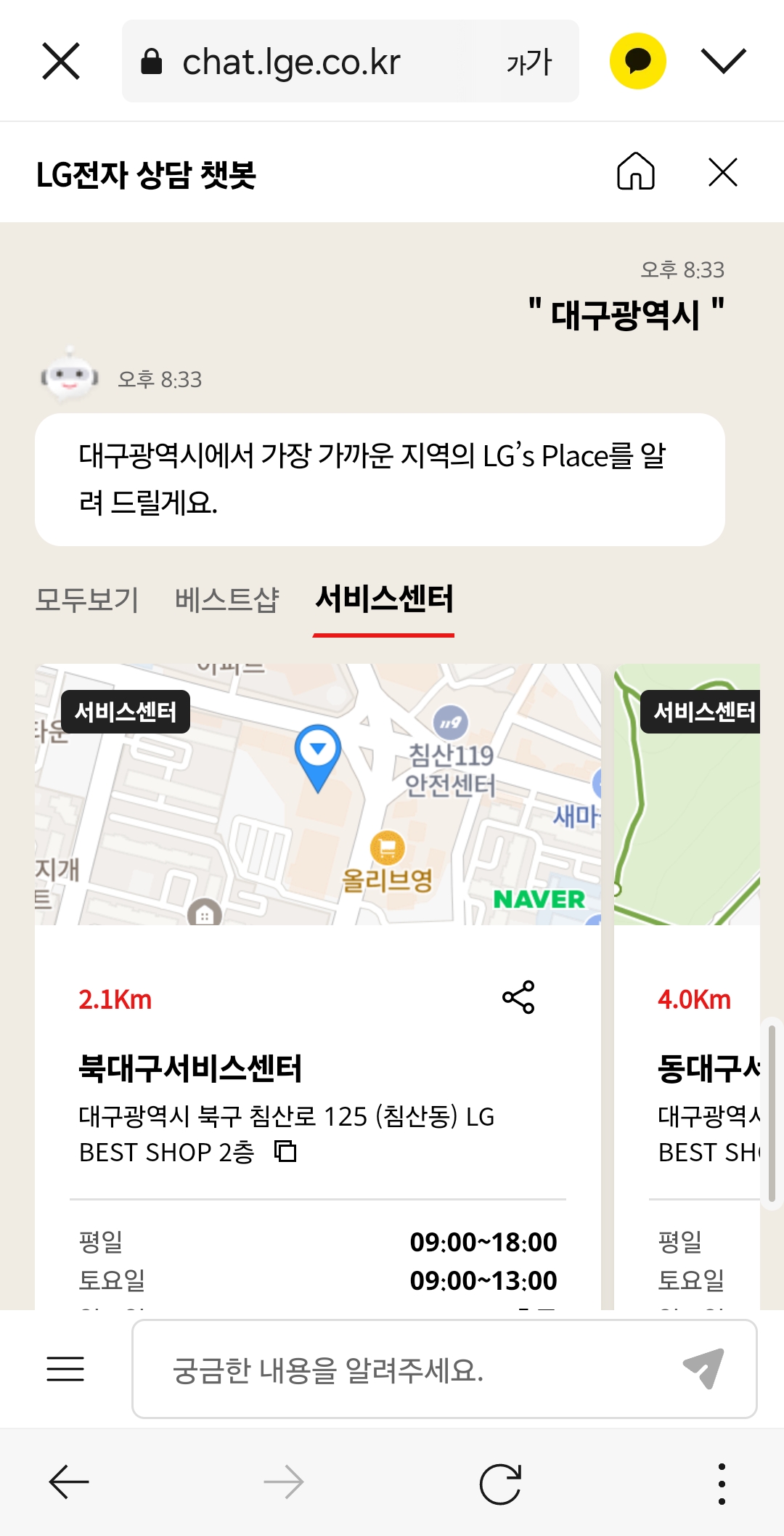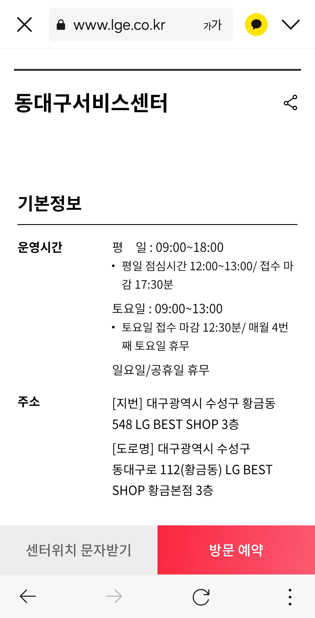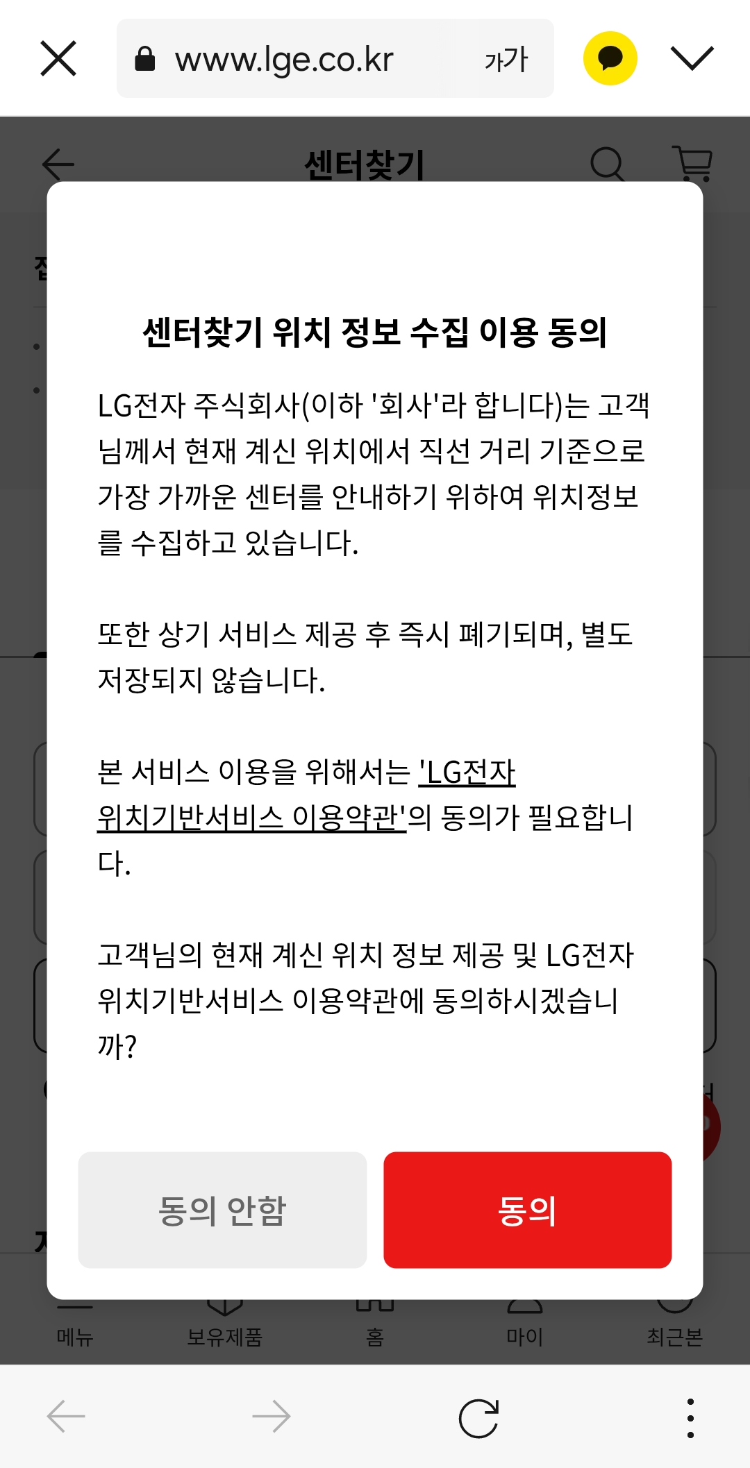 참고로 위치정보 수집 이용 동의를 하시면, 현재 위치에서 가장 가까운 거리에 있는 대구 lg전자 서비스센터를 찾아줍니다.