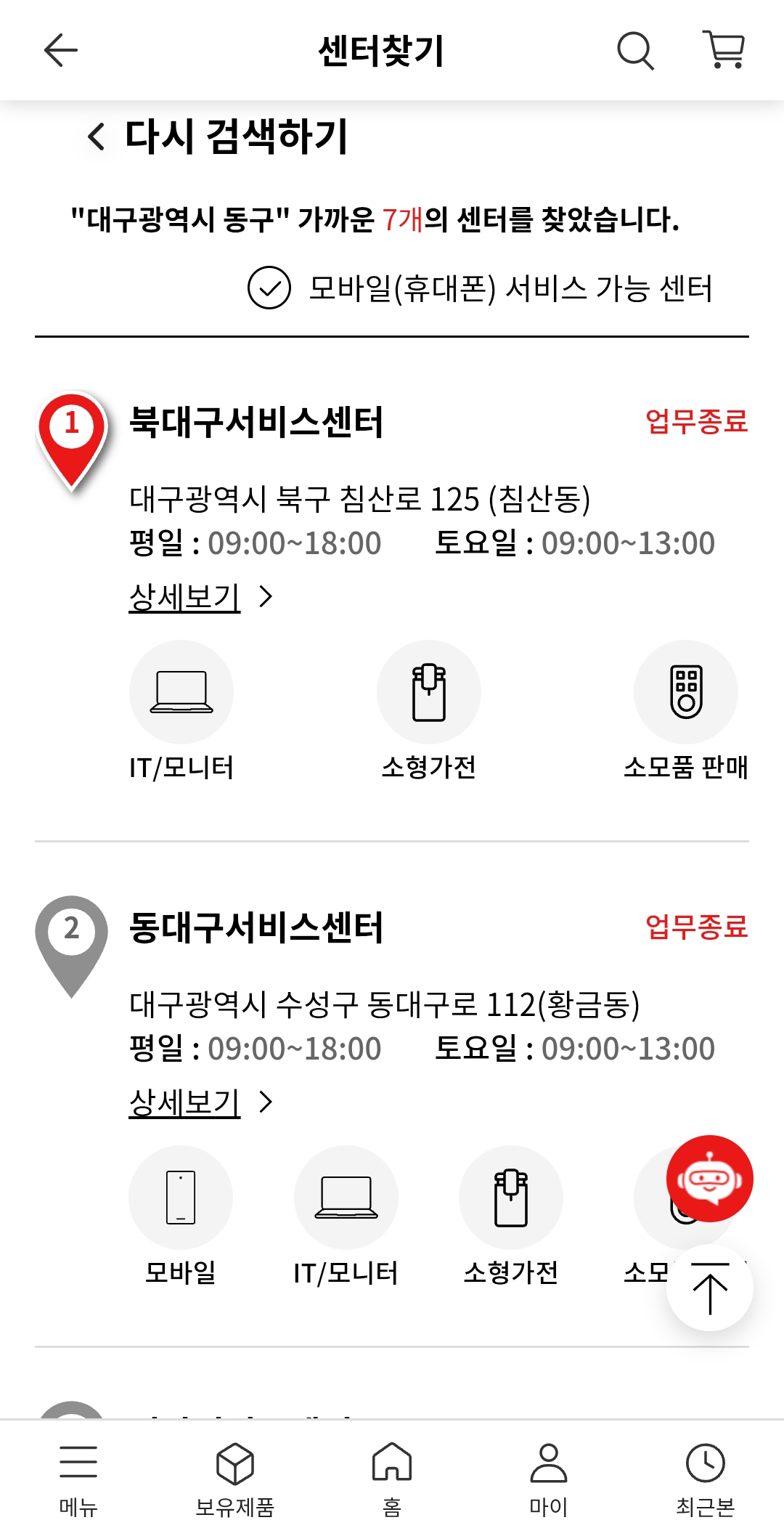 하지만 카테고리를 타고 들어가지 않고 바로 서비스센터를 찾을 수 있기 때문에 효율적인 것 같아요.
